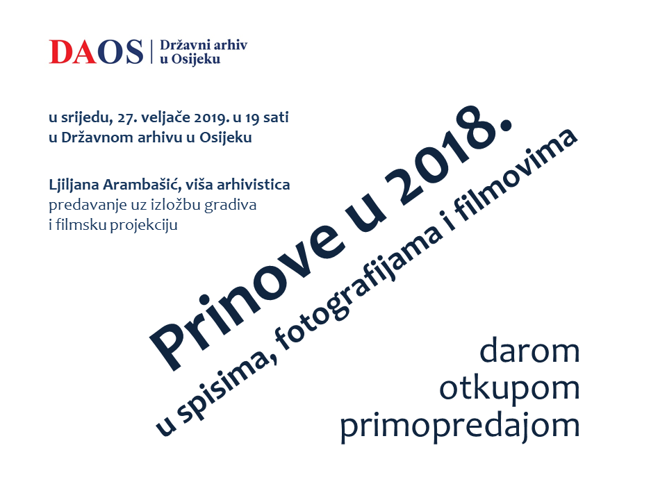 Prvo u nizu predavanja, s izložbom gradiva i filmskom projekcijom, održat će Ljiljana Arambašić, viša arhivistica, voditeljica Odjela za nadzor i zaštitu arhivskog i registraturnog gradiva izvan Arhiva. U predavanju će predstaviti sve prinove (akvizicije) arhivskoga gradiva koje su tijekom 2018. godine postale dio fundusa Državnog arhiva u Osijeku, slijedom službenih primopredaja, darovanjem ili otkupom.