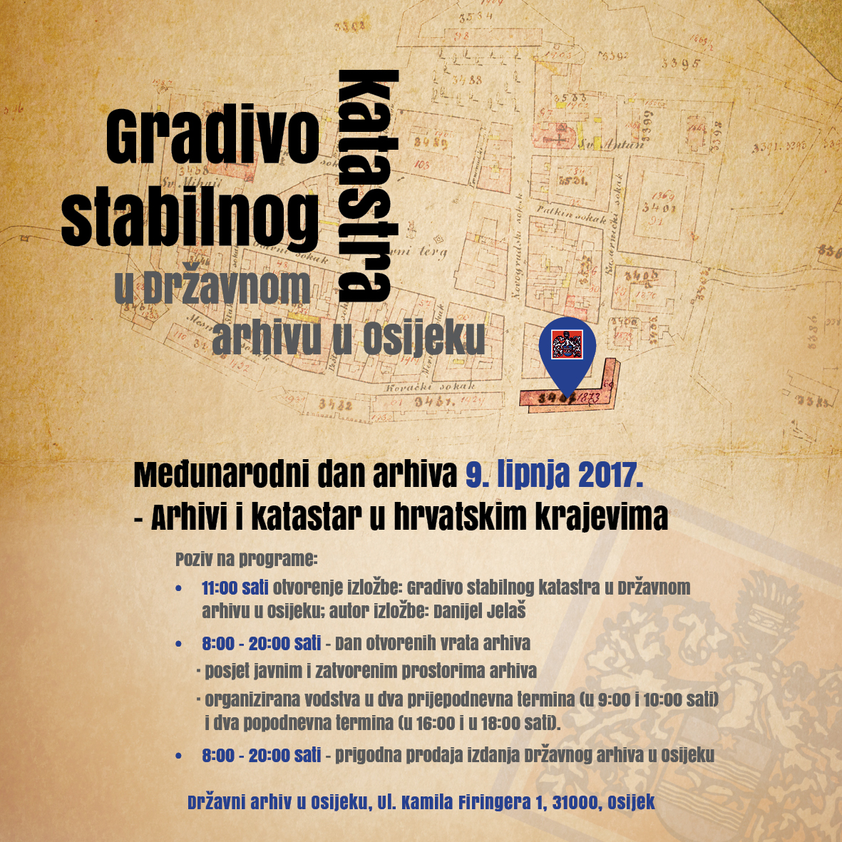 Izložbe Prizori s ljetovanja - izložba iz fundusa DAOS Opširnije 20 osječkih SLUK-ova Opširnije Lice i naličje TVrđe Opširnije Digitalizirane karte Vukovarskog vlastelinstva – sačuvana i dostupna baština Opširnije Božić na starim čestitkama i druge akvizicije u 2021. Opširnije DIGITALNO NAŠE SVAGDAŠNJE - VI TRAŽITE, MI SKENIRAMO Opširnije ARCHIVALIA ARCHITECTURAE SACRAE - PARS PRIMA Opširnije Osječke katastrofe u arhivskim zapisima Opširnije Bicikl u osječkoj prošlosti Opširnije Valpovački vlastelini Prandau-Norman (2018.) Opširnije Gradivo stabilnog katastra u Državnom arhivu u Osijeku (2017.) Opširnije 28. domobranska osječka pješačka pukovnija na fotografijama iz fundusa Državnog arhiva u Osijeku (2017.) Opširnije Državni arhiv u Osijeku u Domovinskom ratu – stradanje i obnova (2016.) Ostavština Josipa Jurja Strossmayera (2015.) Opširnije Život u Osijeku u okolnostima Prvog svjetskog rata (2014.) Opširnije Pisani trag europskog gospodarstva u Osijeku za vrijeme Prvog svjetskog rata (2014.) Opširnije "Decki napred!/Vorwärts Croatische Brüder!" Izložba ratnih razglednica iz ostavštine Ivana Medveda (2014.) Opširnije 19 Izlijevanje Drave Iz Korita 1926 Godine Opširnije MATIČARSTVO I OSOBNI PODACI NA PODRUČJU DRŽAVNOG ARHIVA U OSIJEKU (2011.) Opširnije ARHIVIRANA POVIJEST SLOBODNOG I KRALJEVSKOG GRADA OSIJEKA (2009.) Opširnije TURIZAM NA PODRUČJU OSJEČKO-BARANJSKE ŽUPANIJE (2008.) Opširnije KAZALIŠTE U OSIJEKU DO 1907. prigodom 100. obljetnice HNK u Osijeku 1907.-2007. (2007.) Opširnije 60. GODINA ARHIVSKE DJELATNOSTI DRŽAVNOG ARHIVA U OSIJEKU (2007.) Opširnije DOKUMENTI NA UDARU RATNOG UNIŠTENJA ZA VRIJEME AGRESIJE NA HRVATSKU OD 1991. (2006.) Opširnije ARHIVSKA DJELATNOST I KAMILO FIRINGER (2005.) Opširnije ŠKOLSTVO U ISTOČNOJ HRVATSKOJ DO 1945. GODINE (2004.) Opširnije SVE VODE BLAGOSLIVLJAJTE GOSPODA (2003.) Opširnije NACRTI GRADA OSIJEKA NAKON 1945. GODINE (2003.) Opširnije OSJEČKE BANKE I NOVČARSKI ZAVODI U PROŠLOSTI (2002.) Opširnije GOSPODARSTVO (TVRTKE) U ISTOČNOJ HRVATSKOJ DO 1945. GODINE (2001.) Opširnije POVIJEST UDRUGA I KLUBOVA (2000.) Opširnije KOPAČKI RIT NA STARIM ZEMLJOVIDIMA I NACRTIMA (1998.) Opširnije TRI STOLJEĆA BELJA 1698.-1998. (1998.) Opširnije VUKOVAR I OKOLNA MJESTA NA STARIM KARTAMA (1998.) Opširnije STARI OSIJEK (1997.) Opširnije Baranja Na Starim Kartama Opširnije